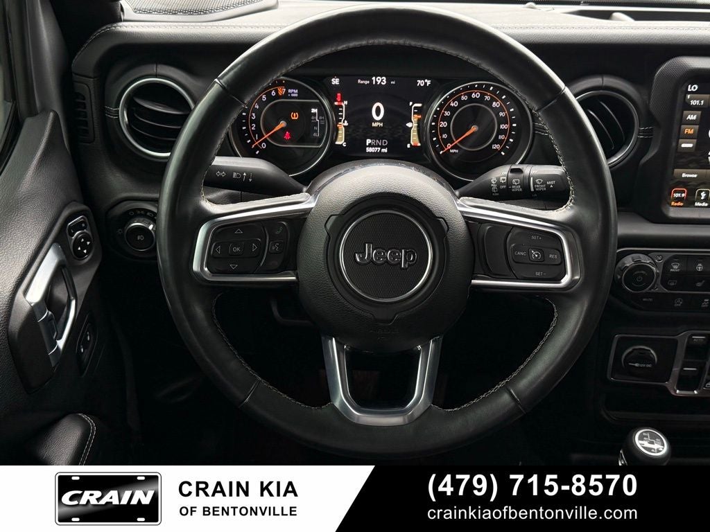 Clean Carfax, 1-Year SiriusXM Guardian Trial, 1-Yr SiriusXM Radio Service, 21.5 Gallon Fuel Tank (DISC), 3.45 Rear Axle Ratio, 4-Wheel Disc Brakes, 5-Year SiriusXM Traffic Service, 5-Year SiriusXM Travel Link Service, 8 Speakers, 8.4 Touchscreen Display, ABS brakes, Air Conditioning, Alloy wheels, Alpine Premium Audio System, AM/FM radio: SiriusXM, Anti-Spin Differential Rear Axle, Apple CarPlay/Android Auto, Auto-Dimming Rear-View Mirror, Automatic temperature control, Black Badges, Blind Spot & Cross Path Detection, Body Color 3-Piece Hard Top, Body Color Grille w/Black Accents, Brake assist, Cloth Low-Back Bucket Seats, Cold Weather Group, Compass, Daytime Running Lamps LED Accents, Delay-off headlights, Driver door bin, Driver vanity mirror, Dual front impact airbags, Dual front side impact airbags, Electronic Infotainment System Group, Electronic Stability Control, For More Info, Call 800-643-2112, Freedom Panel Storage Bag, Front anti-roll bar, Front Bucket Seats, Front Center Armrest w/Storage, Front dual zone A/C, Front fog lights, Front LED Fog Lamps, Front reading lights, Fully automatic headlights, Garage door transmitter, GPS Navigation, HD Radio, Heated door mirrors, Heated Front Seats, Heated Steering Wheel, Heavy Duty Suspension w/Gas Shocks, Hood w/Air Vents, Illuminated entry, Integrated roll-over protection, Leather steering wheel, LED Lighting Group, LED Reflector Headlamps, LED Taillamps, Low tire pressure warning, McKinley Leather Seats w/Jeep Logo, Moab Edition, Moab Hood Badging, MOPAR All-Weather Floor Mats, MOPAR Hardtop Headliner, Non-Lock Fuel Cap w/o Discriminator, Occupant sensing airbag, Outside temperature display, Panic alarm, ParkSense Rear Park Assist System, ParkView Rear Back-Up Camera, Passenger door bin, Passenger vanity mirror, Power door mirrors, Power steering, Power windows, Quick Order Package 24M Moab, Radio data system, Radio: Uconnect 4 w/7 Display, Radio: Uconnect 4C Nav w/8.4 Display, Rear anti-roll bar, Rear reading lights, Rear Window Defroster, Rear Window Wiper/Washer, Remote keyless entry, Remote Proximity Keyless Entry, Remote Start System, Roadside Assistance & 9-1-1 Call, Safety Group, Security system, SiriusXM Traffic Plus, SiriusXM Travel Link, Speed control, Split folding rear seat, Steel Front Bumper, Steering wheel mounted audio controls, Tachometer, Telescoping steering wheel, Tilt steering wheel, Traction control, Trip computer, Variably intermittent wipers, Voltmeter, Wheels: 17 x 7.5 Moab Black Aluminum, Wheels: 18 x 7.5 Polished w/Gray Spokes.