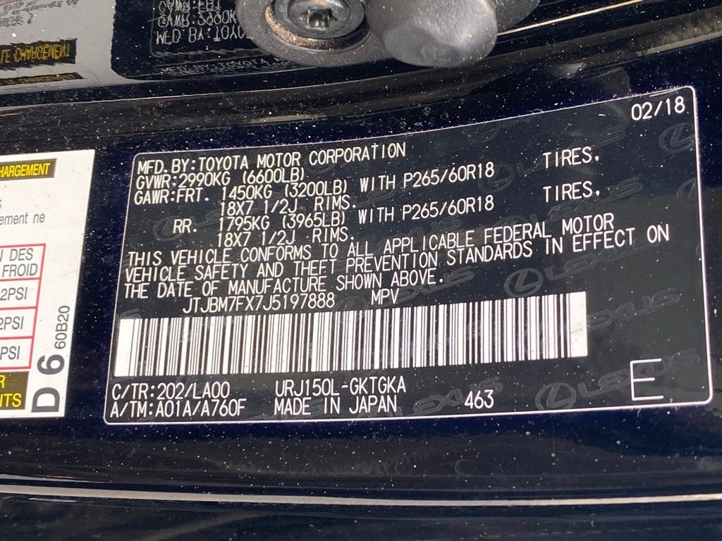 3.909 Axle Ratio, 3rd row seats: split-bench, 4-Wheel Disc Brakes, 9 Speakers, ABS brakes, Air Conditioning, Alloy Wheel Locks, Alloy wheels, AM/FM radio: SiriusXM, Anti-whiplash front head restraints, Auto tilt-away steering wheel, Auto-Dimming & Power-Folding Exterior Mirrors, Auto-dimming Rear-View mirror, Automatic temperature control, Blind Spot Monitor w/Rear Cross Traffic Alert, Bodyside moldings, Brake assist, Bumpers: body-color, Cargo Net, Cargo-Area Tonneau Cover, Carpet Cargo Mat, CD player, Compass, Delay-off headlights, Door Edge Guards, Driver door bin, Driver vanity mirror, Driver's Seat Mounted Armrest, Dual Front & Rear Auto Air Conditioner, Dual front impact airbags, Dual front side impact airbags, Electronic Stability Control, Emergency communication system, Exhaust Tip, Exterior Parking Camera Rear, Front & Rear Heated Seats, Front anti-roll bar, Front Bucket Seats, Front dual zone A/C, Front reading lights, Front wheel independent suspension, Fully automatic headlights, Garage door transmitter: HomeLink, Headlamp Washers, Heated door mirrors, Illuminated entry, Illuminated running boards, Intuitive Parking Assist, Key Gloves, Knee airbag, Leather Seat Trim, Leather Shift Knob, Leather steering wheel, LED Front Fog & Driving Lamp, Lexus Enform Destinations, Low tire pressure warning, Mahogany Wood & Leather Trimmed Steering Wheel, Memory seat, Navigation Package, Occupant sensing airbag, Outside temperature display, Overhead airbag, Overhead console, Panic alarm, Passenger door bin, Passenger seat mounted armrest, Passenger vanity mirror, Power door mirrors, Power driver seat, Power moonroof, Power passenger seat, Power steering, Power windows, Preferred Accessory Package, Premium Package, Radio data system, Radio: AM/FM Lexus Premium Audio, Rain Sensing Intermittent Wipers, Rear anti-roll bar, Rear reading lights, Rear seat center armrest, Rear side impact airbag, Rear window defroster, Rear window wiper, Remote keyless entry, Roof rack: rails only, Security system, Speed control, Speed-sensing steering, Split folding rear seat, Spoiler, Steering wheel memory, Steering wheel mounted audio controls, Synthetic Leather NuLuxe Seat Trim, Tachometer, Telescoping steering wheel, Tilt steering wheel, Tow Hitch Receiver & Ball Mount, Traction control, Trip computer, Turn signal indicator mirrors, Variably intermittent wipers, Ventilated Front Seats, Wheels: 18 x 7.5J 6-Spoke Aluminum Alloy, Wheels: 18 x 7.5J Split 6-Spoke Aluminum Alloy, Windshield De-Icer.